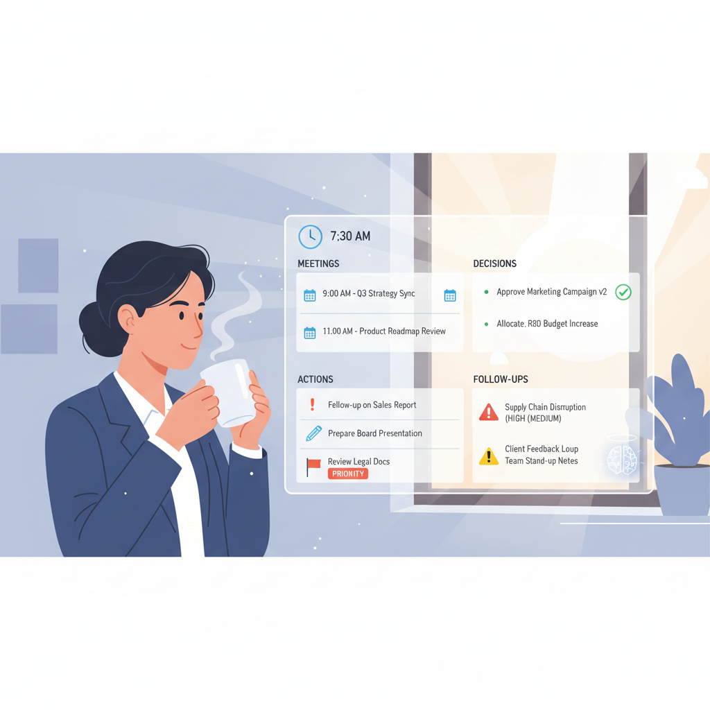 Think of it as a personalized executive dashboard delivered every morning. Instead of sorting through multiple platforms to understand your day, everything is synthesized into one clear, actionable brief.