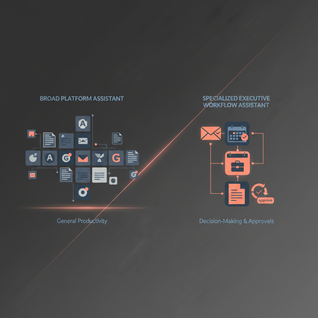 This is why specialized assistants are increasingly framed less as "AI app" and more as AI executive assistant or AI Chief of Staff categories. The promise is narrower than Copilot's, but deeper: reduce executive coordination load without handing away executive judgment.