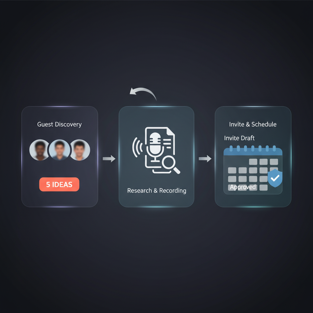 Guest booking has several steps: (1) discover who's in the news or relevant to your audience and not already in your DB, (2) research them (company, timeline, media, "spicy" questions), (3) find contact (e.g. LeadIQ), (4) draft and send the invite, (5) track pending/confirmed in Notion or your CRM. Each step takes time, and when it's manual you get: